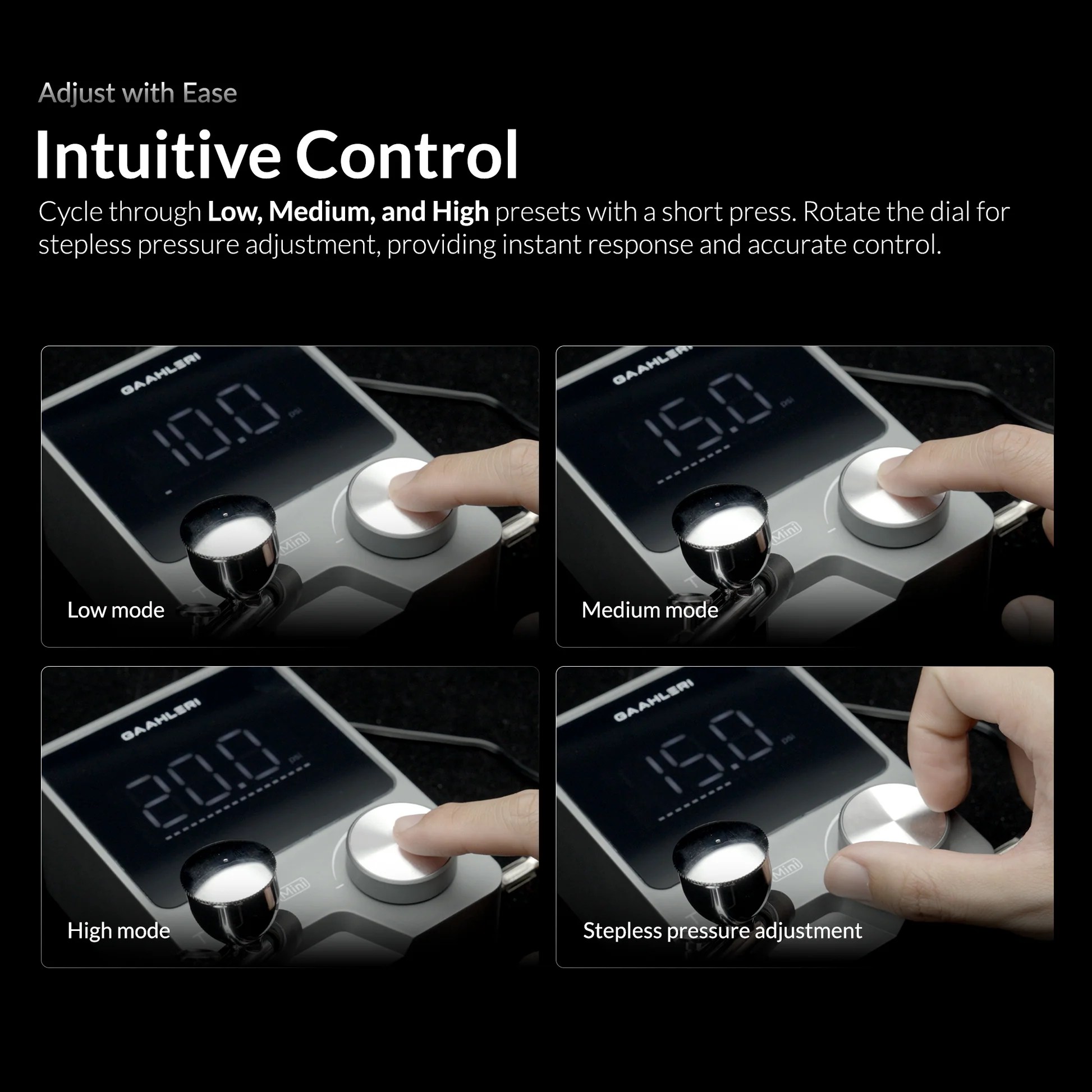 Simply press the knob to quickly cycle through Low, Medium, and High preset modes. Rotate the knob to adjust pressure with instant feedback, giving you precise single-finger control. Rated pressure range: 8–36 psi.
