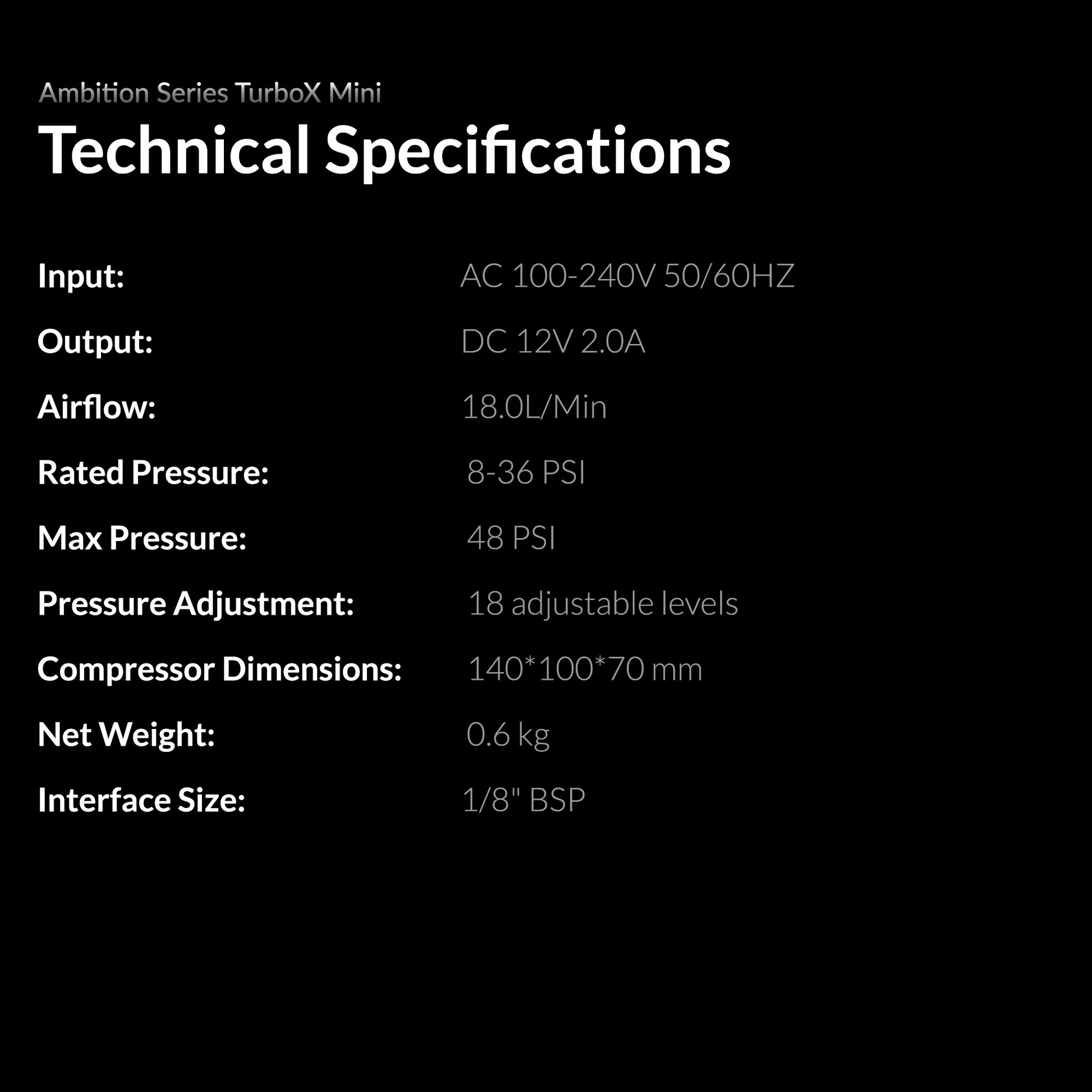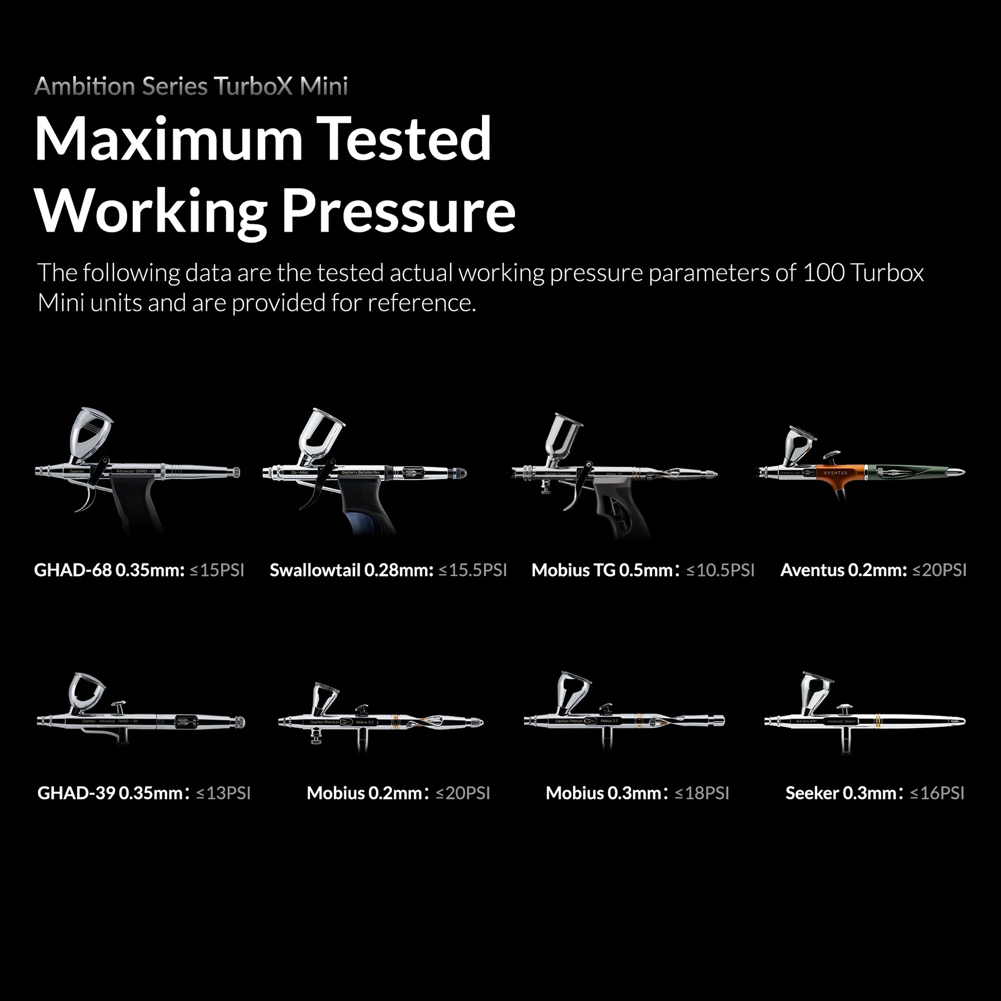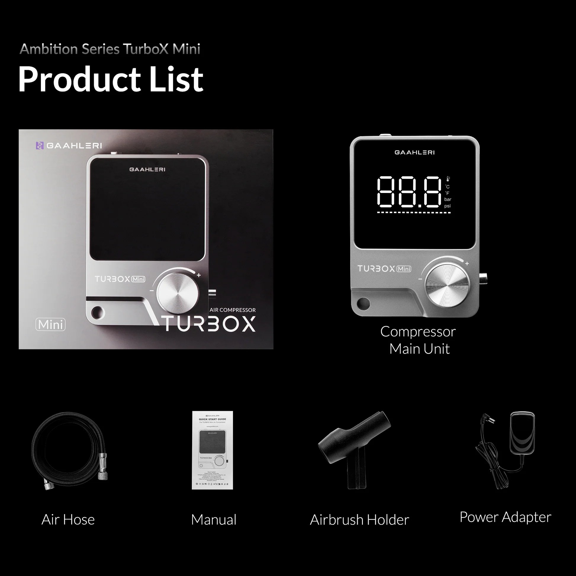 Built-in overheat alarm system provides high-temperature warning and overheat protection. Package includes: One Turbox Mini airbrush compressor set and air hose with a simple airbrush holder.